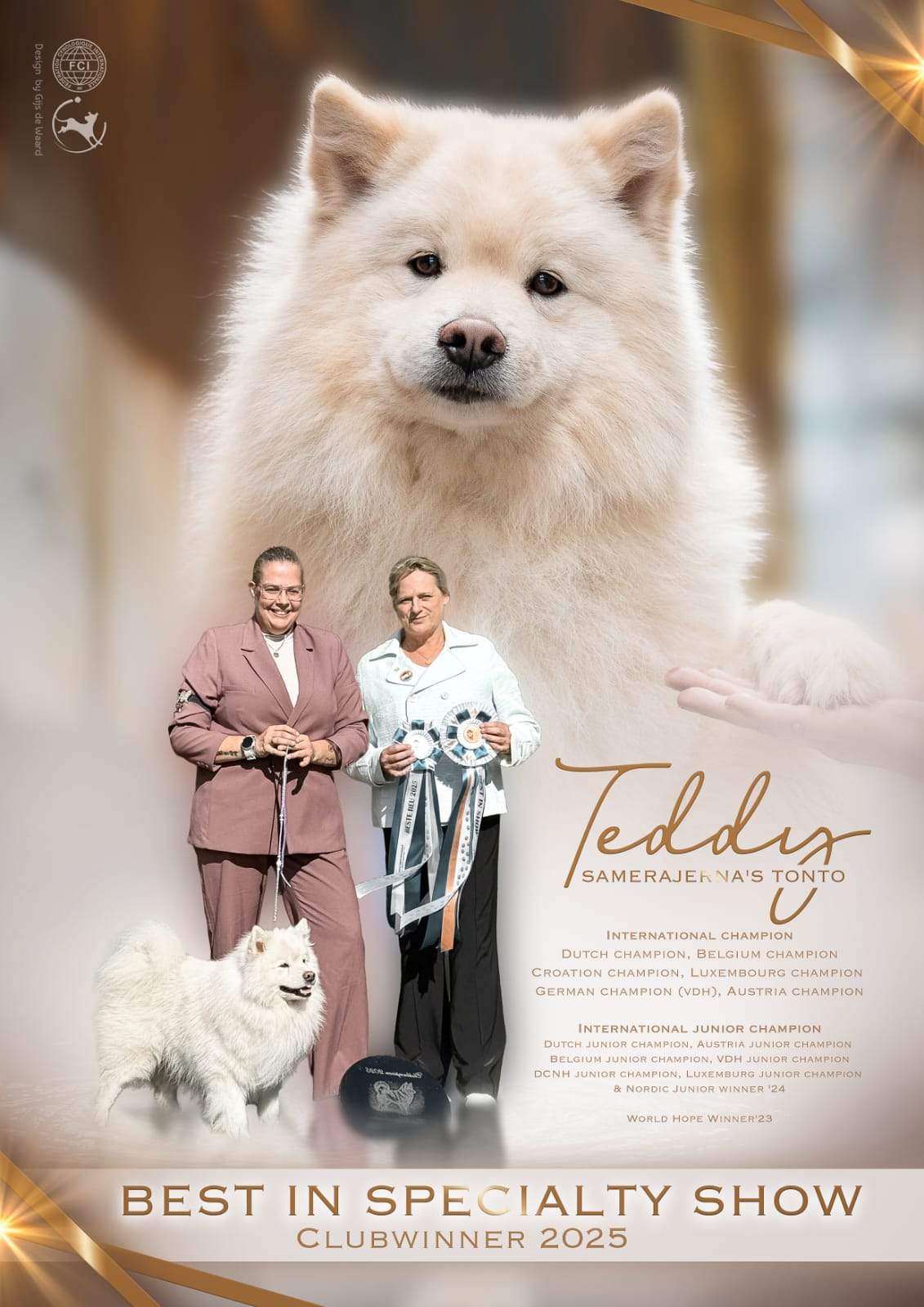 Teddy komt uit een prachtige combinatie van ouders, de eerste generaties (1/4) ouders zijn voor mijn kennel nieuw. Maar waar ik echt voor ben gevallen zijn de rastypische teddyberen in zijn lijn, zo mooi sterk van bouw, goede vachten en prachtige koppen met ook nog eens geweldige karakters. Zijn oma ( lapinlumon tupasvilla) heb ik mogen leren kennen op EDS Brussel 2016 waar zij BEST OF BREED werd en ik totaal verliefd werd op haar, het is dan ook een droom voor mij dat ik nu een kleinzoon van haar mag ontvangen in mijn kennel.